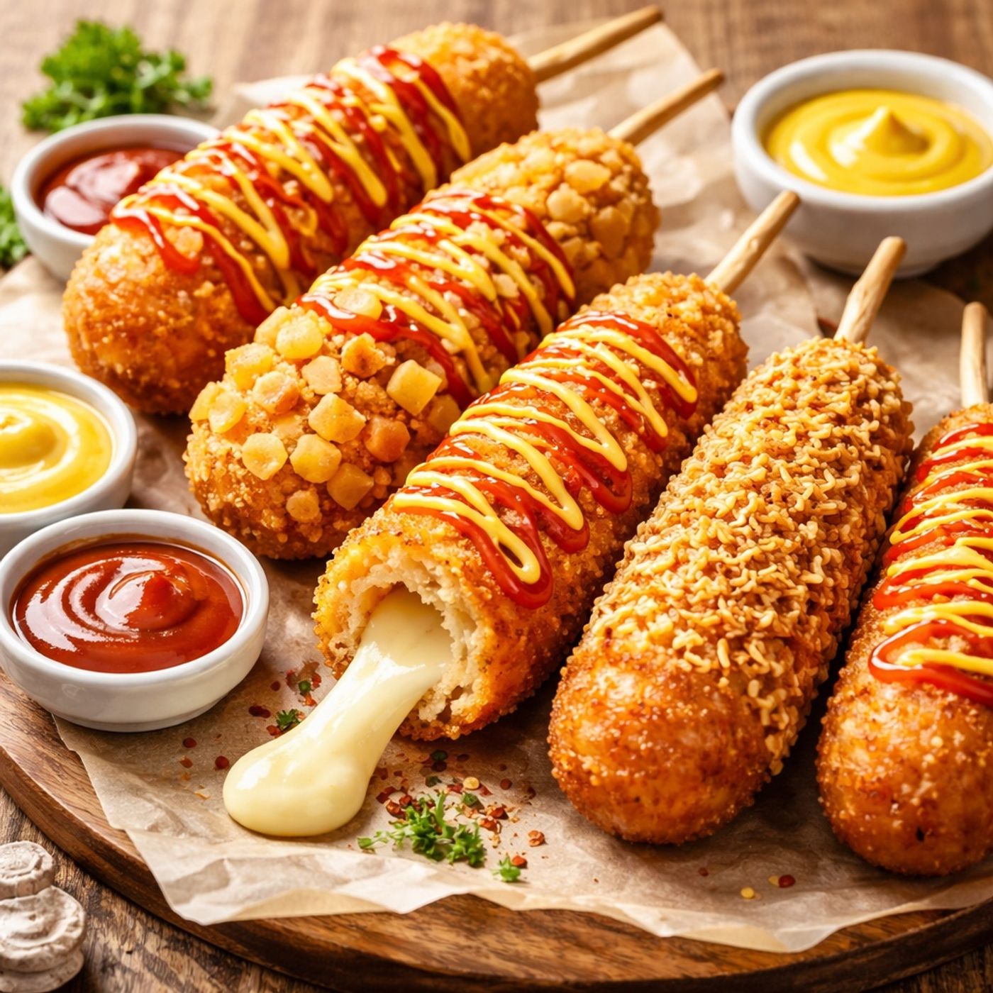 Explains how to make Korean corn dogs, a popular street food known for its crispy exterior and gooey cheese interior. It begins with a quick dough using flour, sugar, eggs, and milk that eliminates the long wait of traditional yeast recipes. Variations include sticks stuffed with hot dogs and cheese, as well as coatings like diced potatoes or crushed noodles. Key steps focus on pressing the breading firmly and frying briefly in medium-heat oil for the perfect crunch. The recipe finishes with classic mustard and ketchup, producing a snack that is both easy to prepare and visually appealing.<...