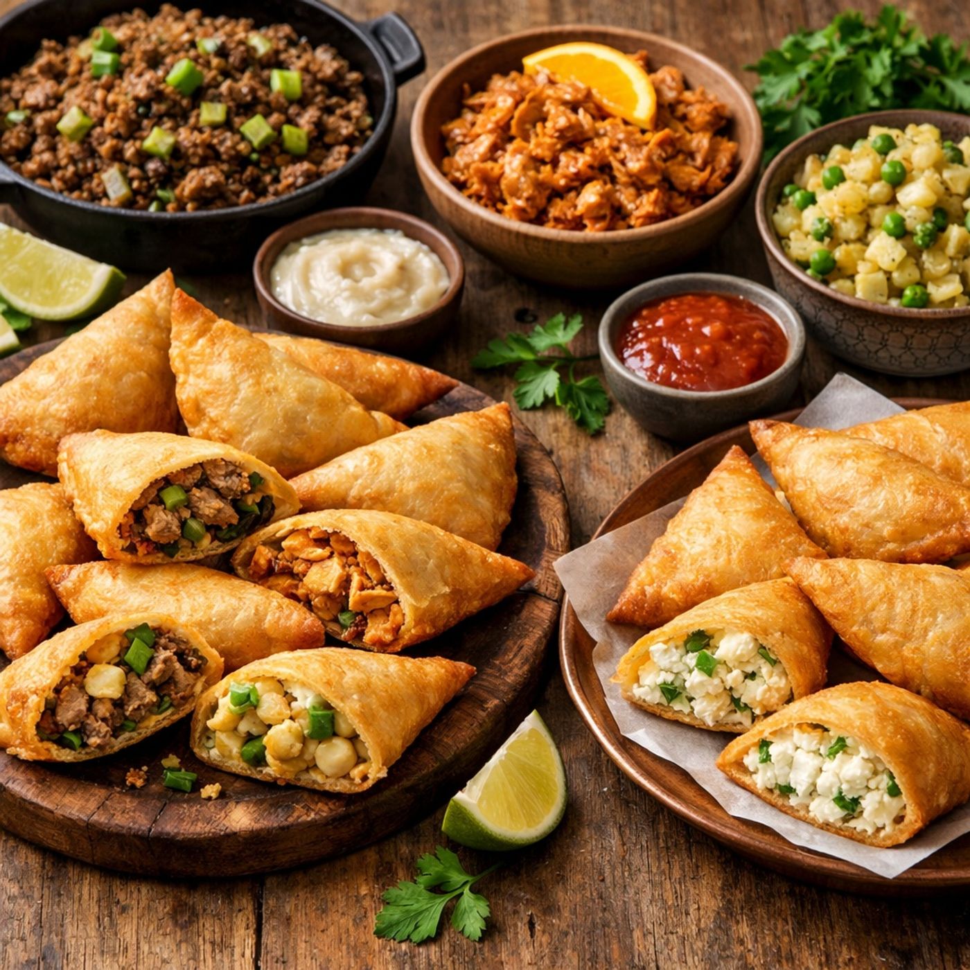 A comprehensive guide explains how to prepare four exceptional fillings for Ramadan sambousek, focusing on distinct flavors without complicated ingredients. The tutorial includes a savory spiced meat mixture with fresh leeks, a zesty chicken shawarma marinated in orange juice and yogurt, an economical Indian-inspired potato filling with peas and ginger, and a decadent five-cheese blend with feta and herbs. Proper cooking techniques are emphasized, such as removing excess moisture from meat and cooling ingredients before assembly, and expert tips are provided for folding and sealing the pastries with flour paste to ensure they remain crisp when fried or baked.<...
