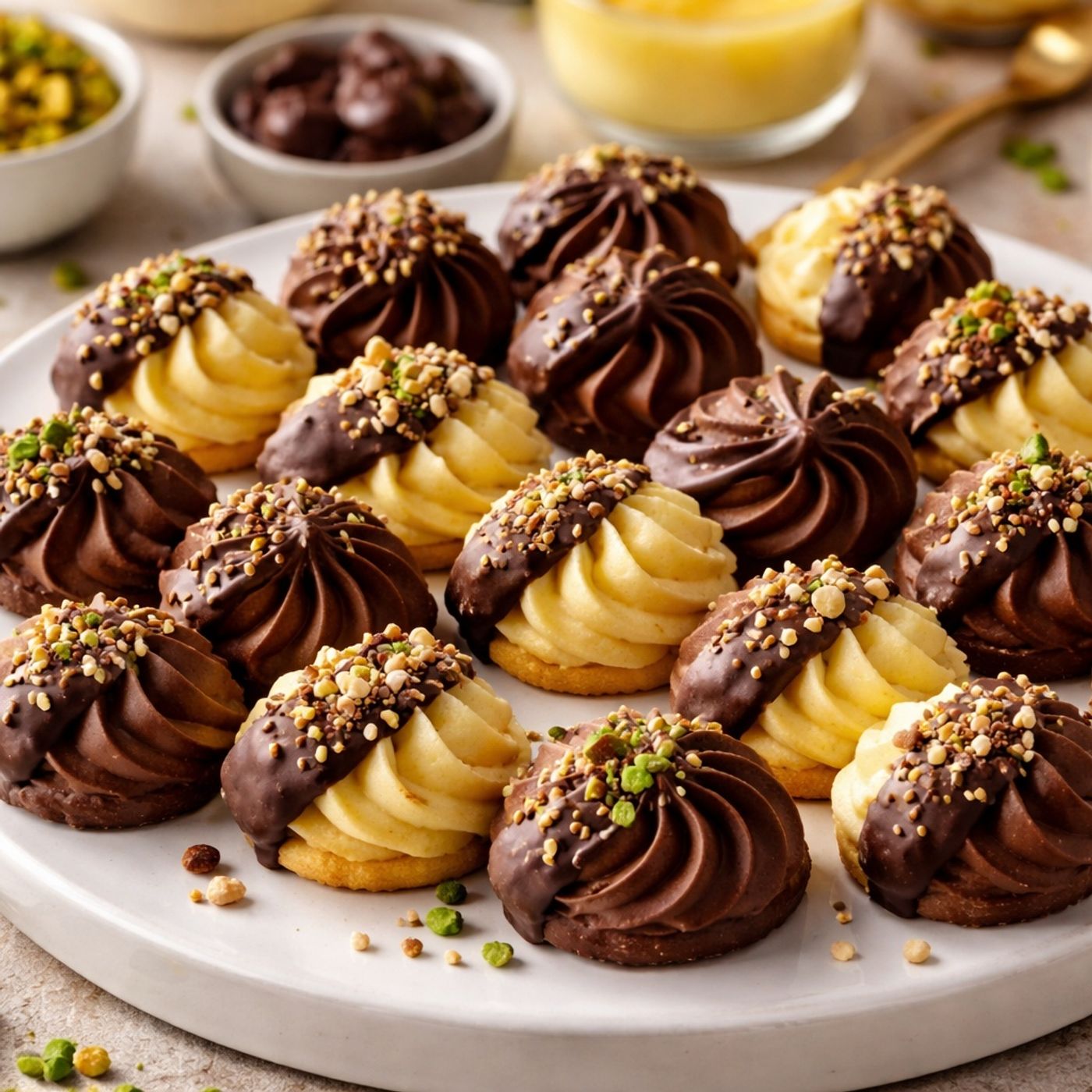 Details how to make premium festive petifour cookies by using high-quality cake flour, cold butter, and ghee to achieve a melt-in-the-mouth texture without chemical leaveners, carefully creaming and incorporating eggs, preparing both vanilla and chocolate varieties, employing precise piping techniques, controlling baking temperatures for a golden finish, assembling with melted chocolate to maintain crispness, and finishing with elegant garnishes like nuts or sprinkles for a professional result.