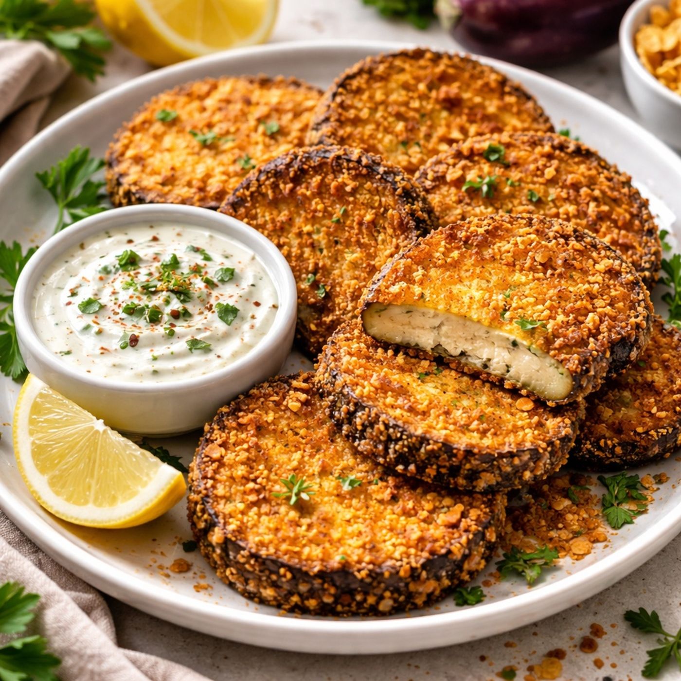 Shows how to make a healthier, satisfying alternative to meat-heavy meals by soaking thick eggplant slices in salt water, coating them with crushed cornflakes and spices for maximum texture, cooking them to a crispy golden exterior with a creamy center using an air fryer, oven, or traditional frying, and serving them with a quick yogurt-based ranch sauce and a splash of lemon for a light yet filling dish that stays firm and flavorful without excess oil.