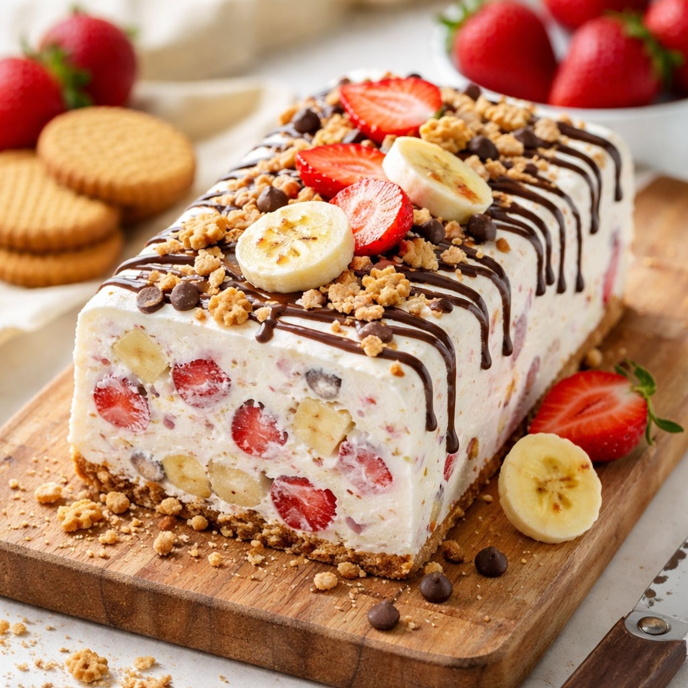Explains how to make a refreshing no-bake ice cream cake ideal for hot weather using simple household ingredients. Heavy cream or chantilly powder is whipped with cold milk to form a light, creamy base, into which chopped biscuits and fruits like strawberries and bananas are folded. Optional additions such as chocolate chips or melted chocolate can enhance flavor and presentation. The mixture is frozen in a loaf pan and served chilled, combining crunchy cookies with smooth cream and fruit for a quick, convenient, and sophisticated dessert.