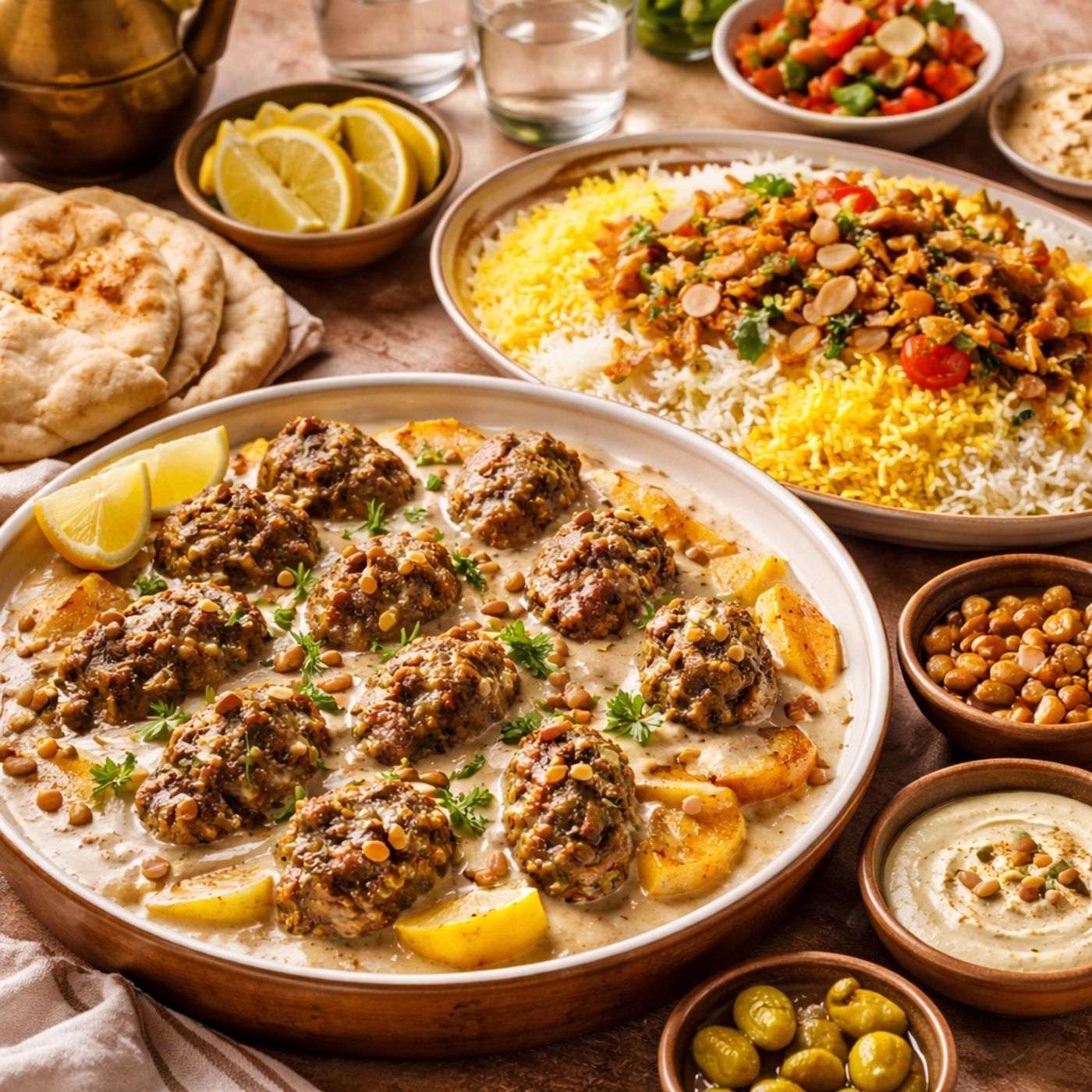 A complete tutorial for a luxurious Ramadan meal featuring kofta with tahini sauce and fragrant basmati rice. It explains how to prepare a tender, spice-seasoned meat mixture layered with onions and potatoes, baked and smothered in creamy tahini, alongside two-toned saffron and rose water rice topped with sautéed garlic and vegetables. The recipes highlight flexibility in assembly and serving, allowing the dish to be paired with bread or rice, and are designed to create an impressive, flavorful family feast with minimal effort.