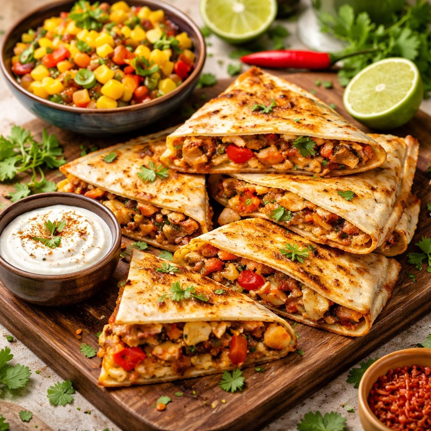 A comprehensive tutorial on preparing authentic chicken quesadillas paired with a refreshing mango salsa. The process begins with marinating chicken thighs in a custom blend of cumin, chili powder, cinnamon, and salt before sautéing them with vibrant bell peppers and onions. To complement the savory dish, the author creates a zesty side dish by mixing diced mango, peppers, and cilantro with citrus. For assembly, the seasoned chicken and a creamy yogurt-based sauce are folded into tortillas with a blend of melted cheeses. The final result is a quick and flavorful Mexican-inspired meal that can be grilled, toasted in a...