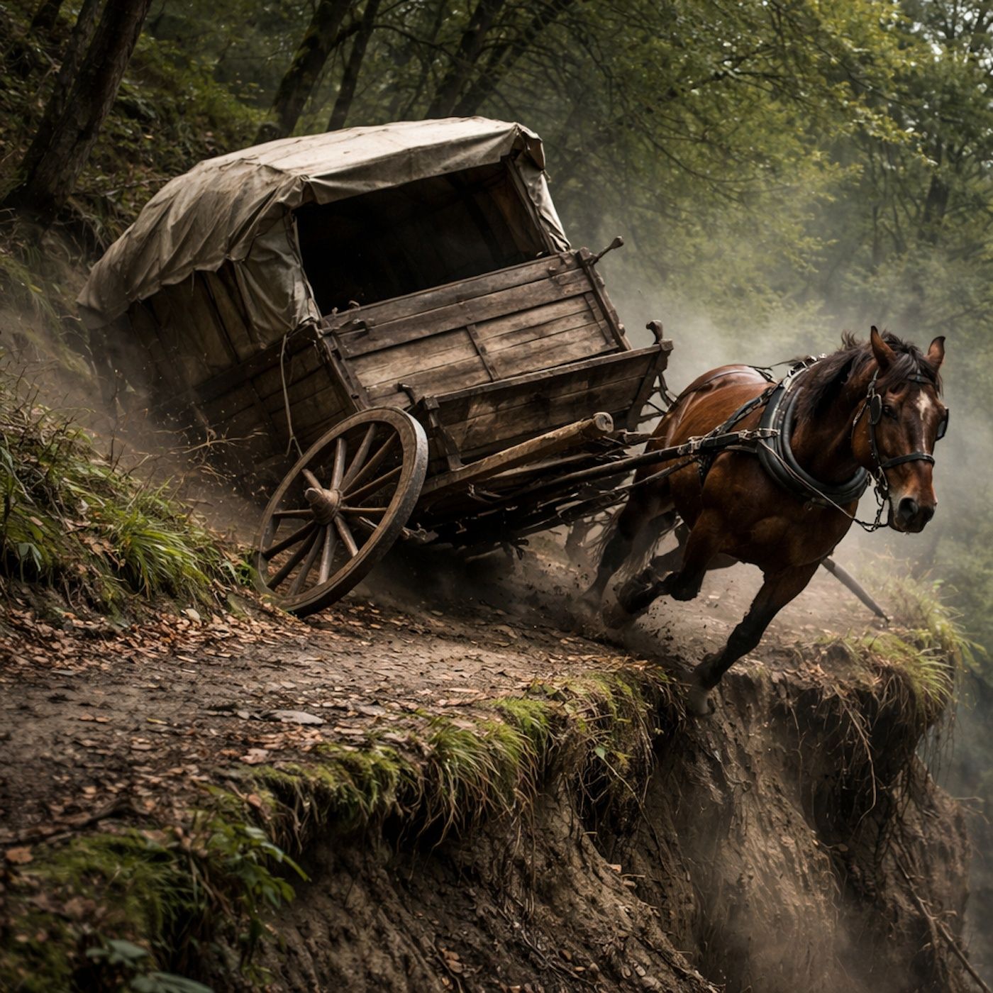 Hooves lock tight on a narrow road blocked by a dead horse.