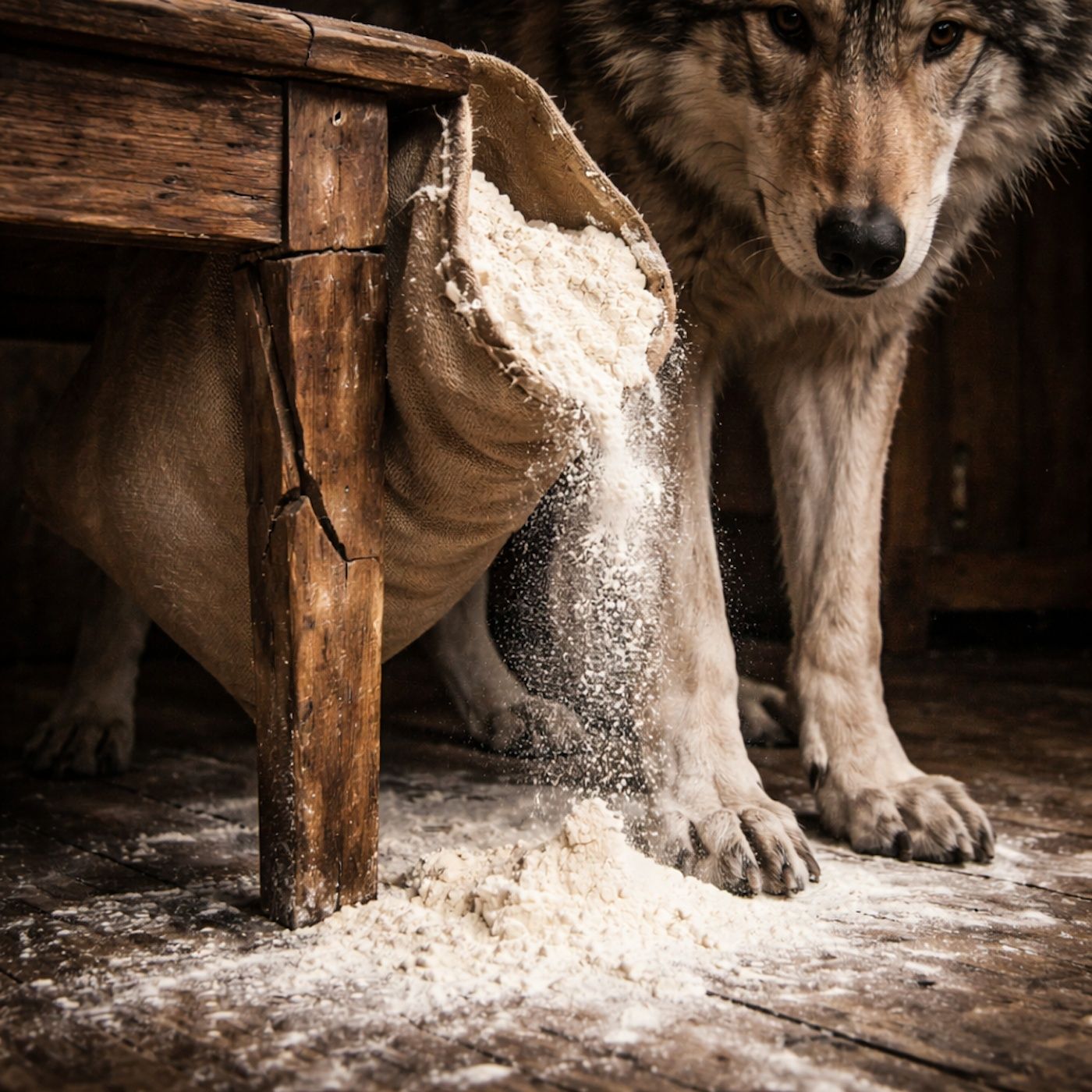 Flour spills across wolf paws