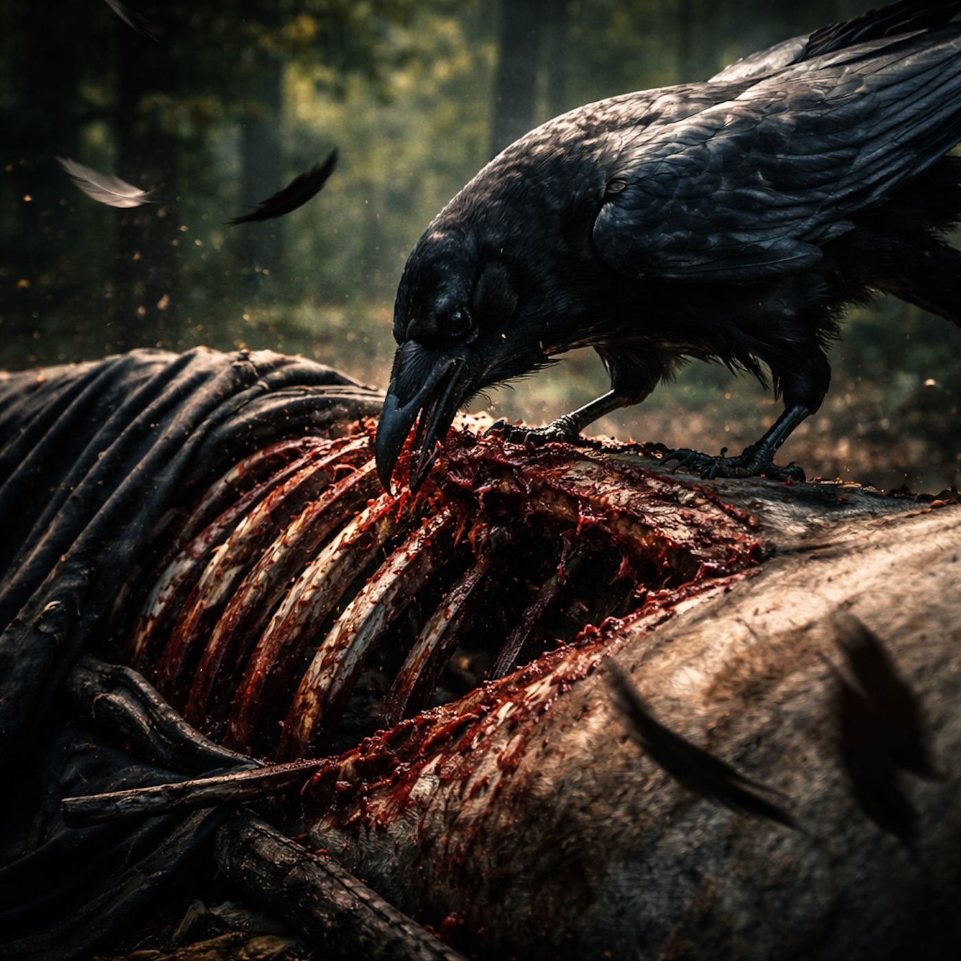 A raven tears into a dead horse on a silent road.
