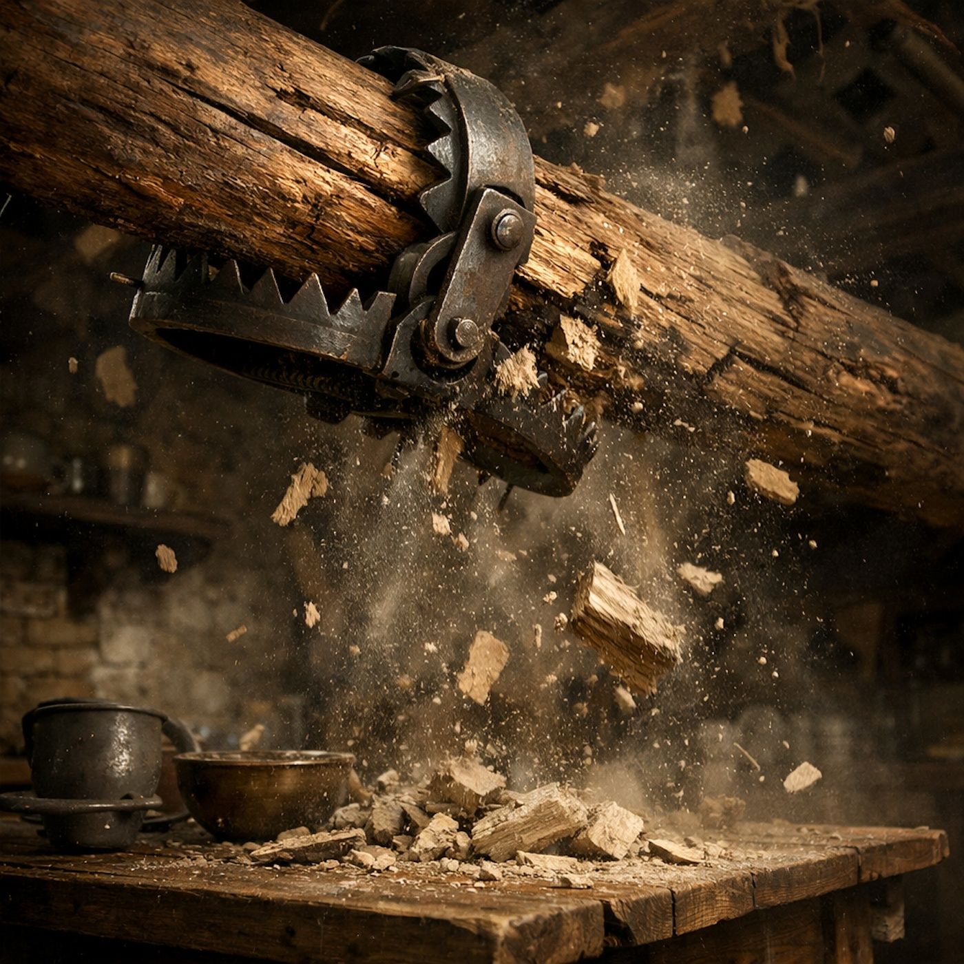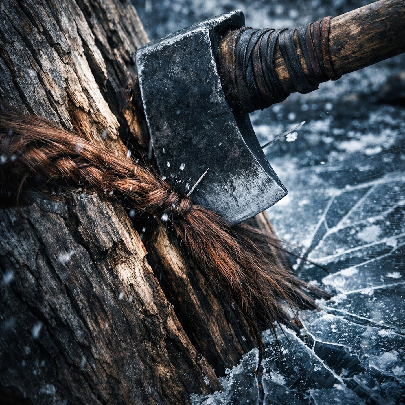 An axe bites into a trunk and traps the dwarf’s beard mid-split.