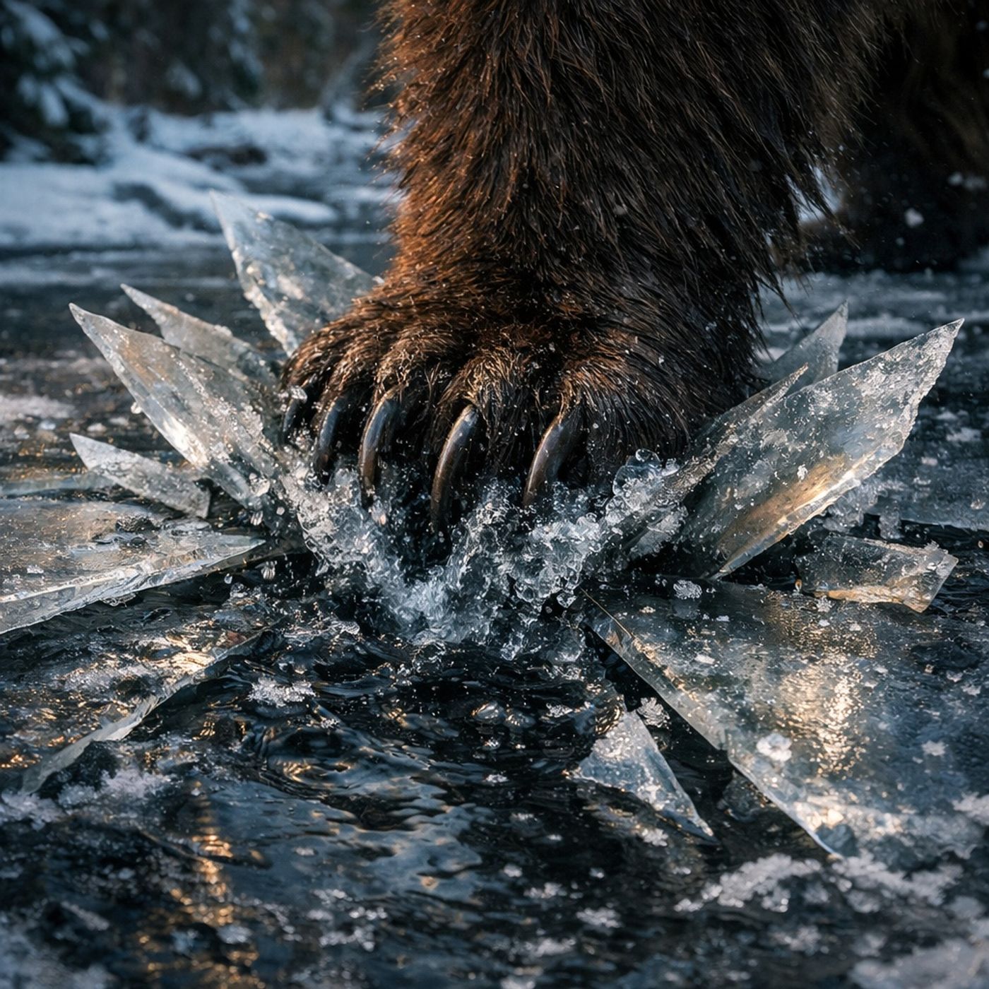 A frozen stream fractures under a bear’s weight, water surging through breaking ice.