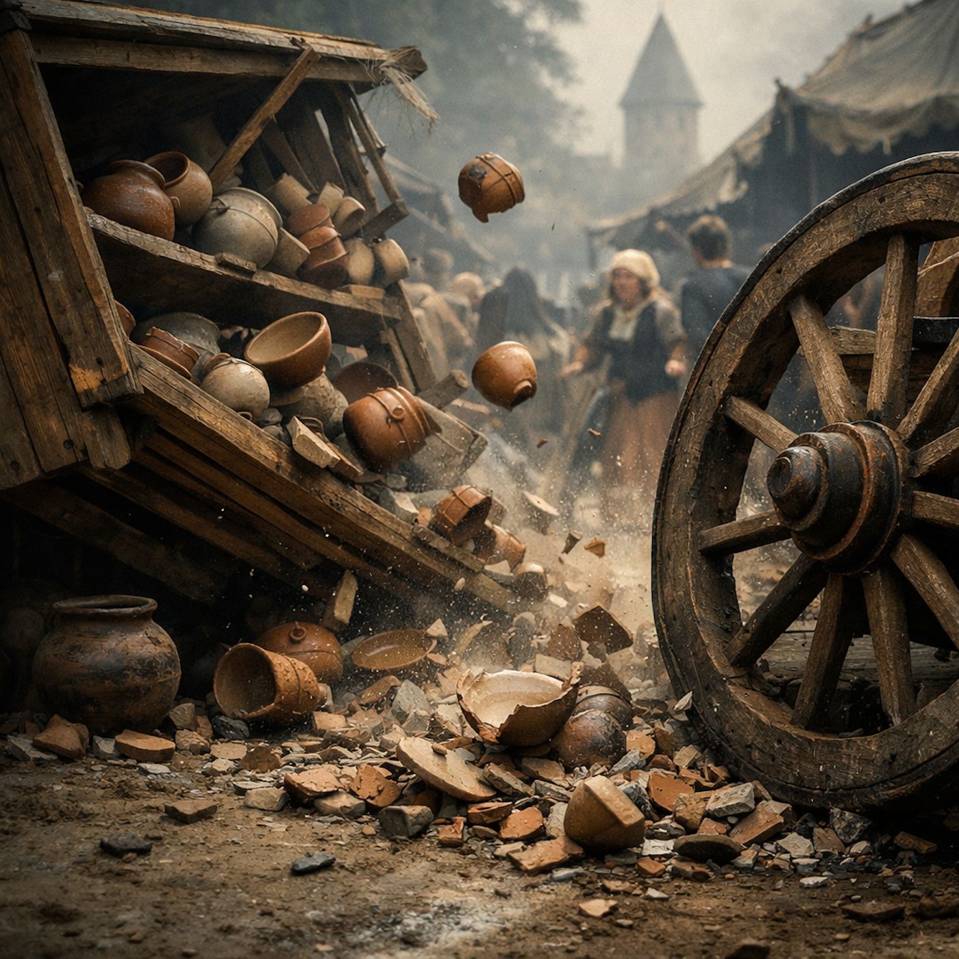 A cramped pottery stall buckles in the market road, sending clay bowls shattering beneath a passing cart. King Thrushbeard's lesson begins — and the princess has no choice but to watch her pride break with every piece.