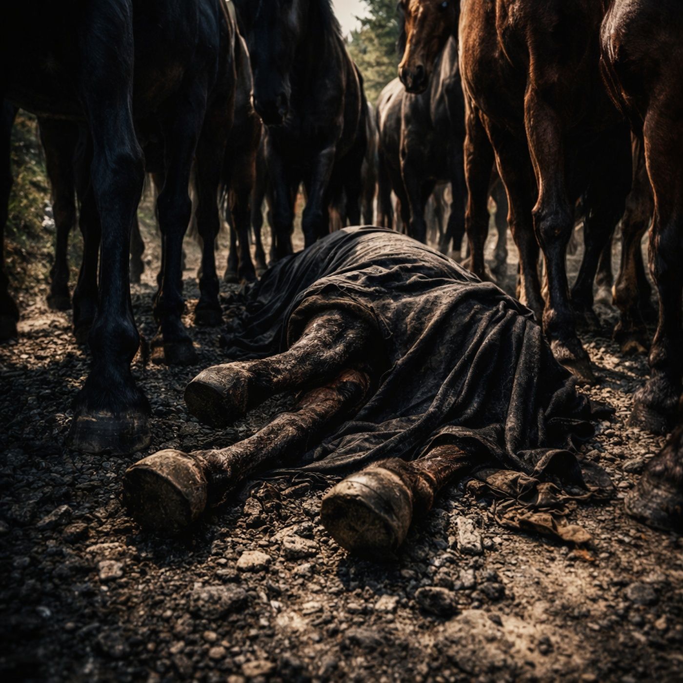 A cloak snaps over a dead horse in the middle of the road.