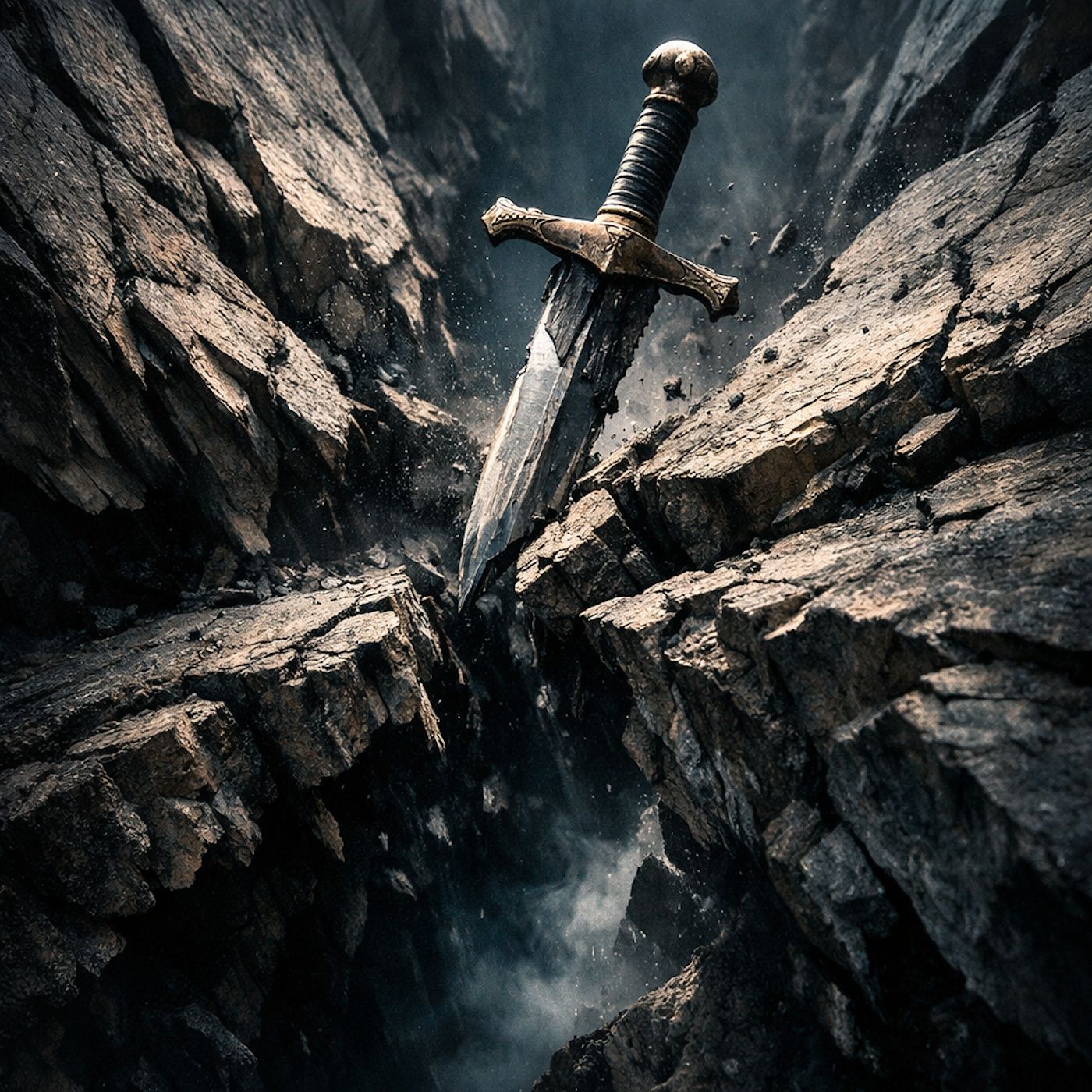 A sword is lodged as the mountain face begins to split.