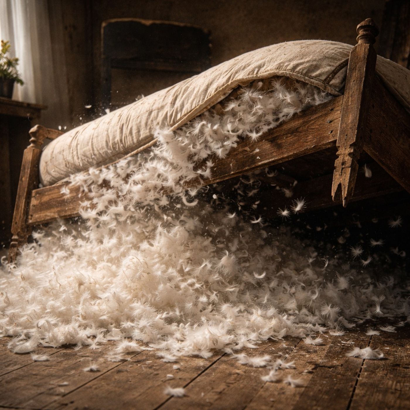 Feather bed bursts open