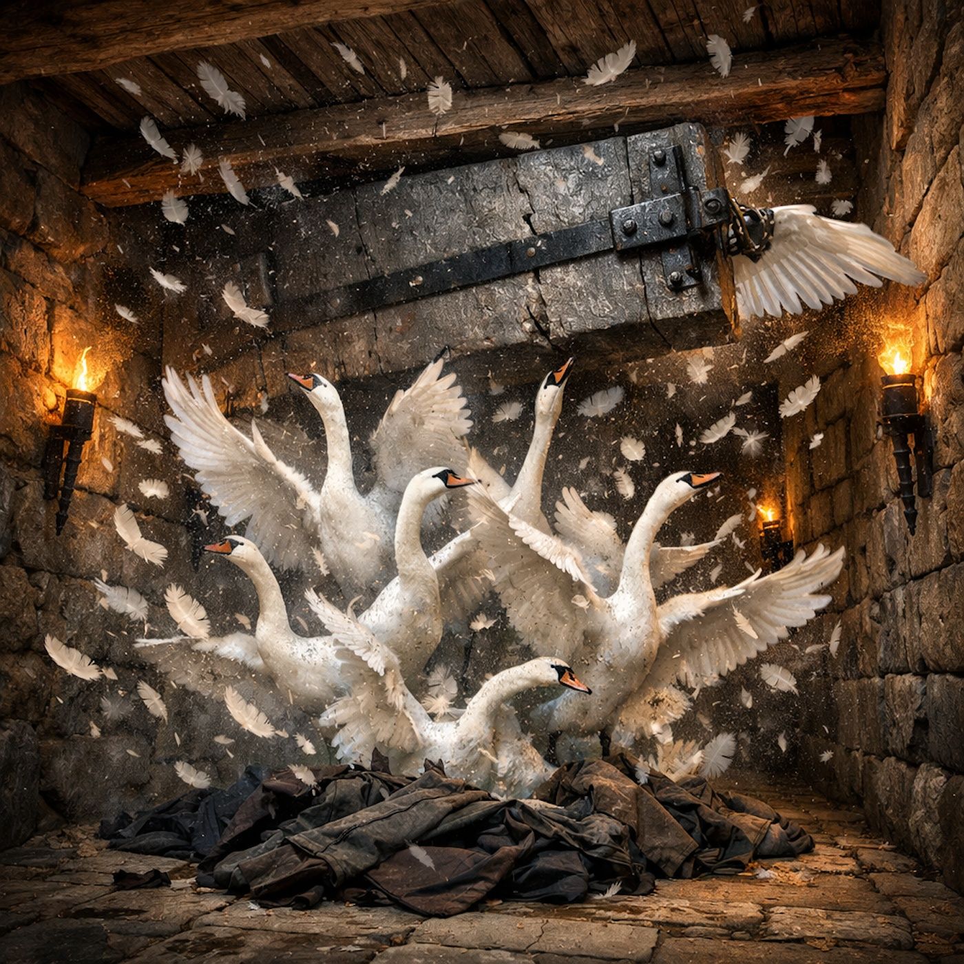 A princess stays silent six years sewing starwort shirts to free swan brothers, endures false child-murder accusations, faces execution, completes the spell, restores them, and exposes the true culprit.