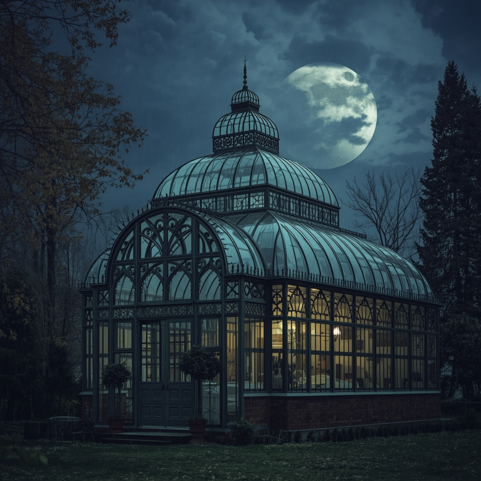 This is an adventure of visiting an ornate greenhouse in the rain at night.
