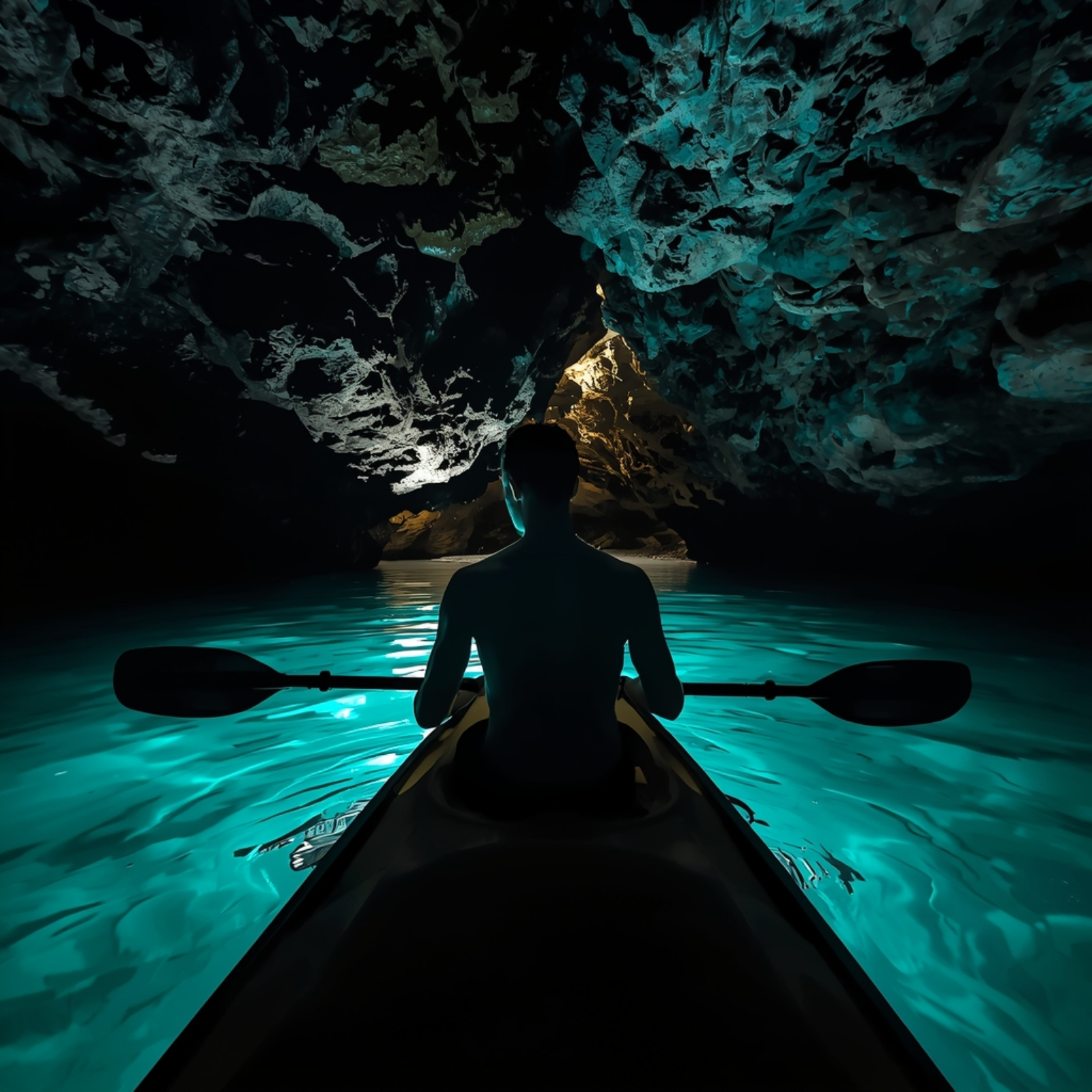 In this adventure, you imagine exploring a grotto with bioluminescent water in a kayak.