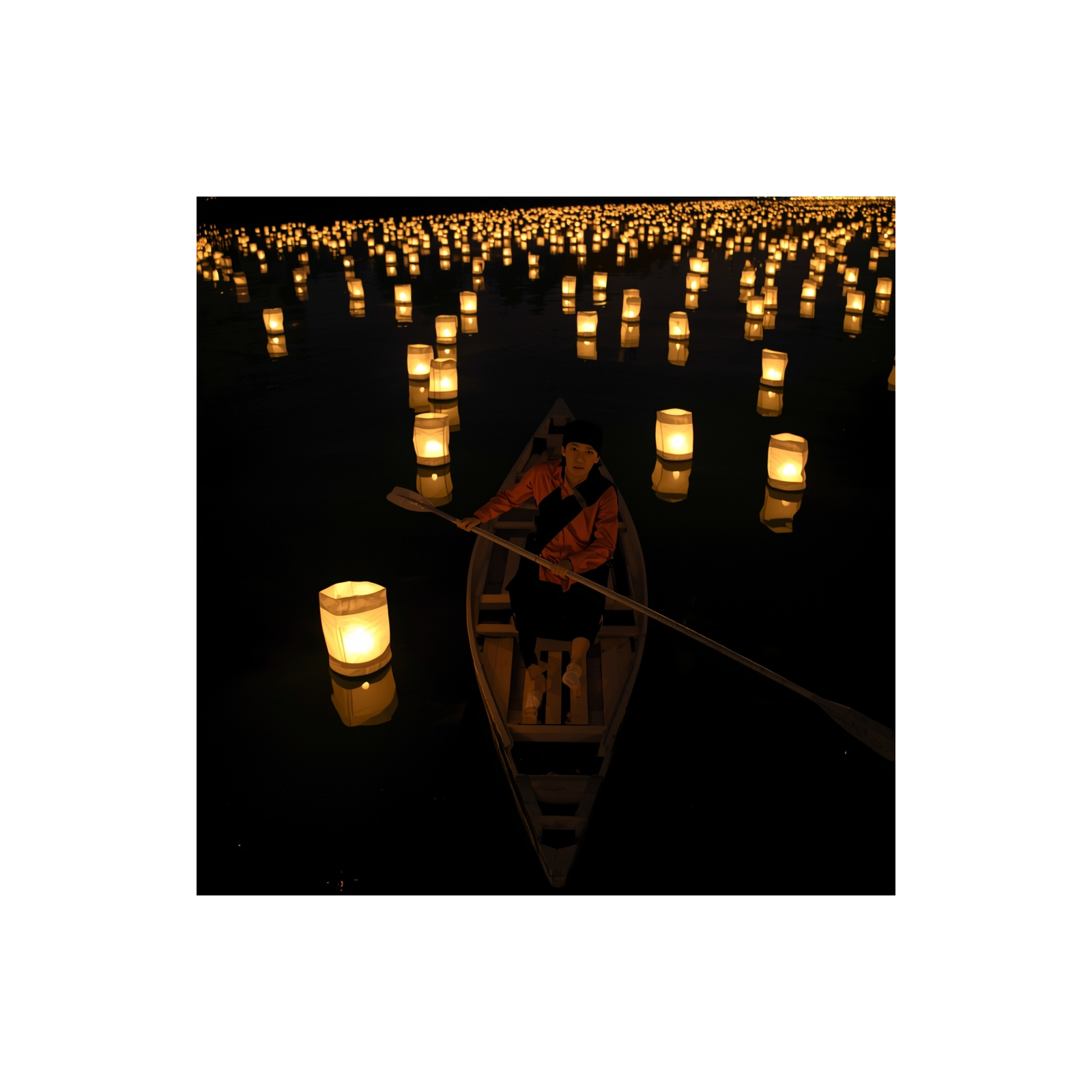Imagine being in a skiff on an extremely calm river, as paper lanterns, representing hopes and dreams float downstream.