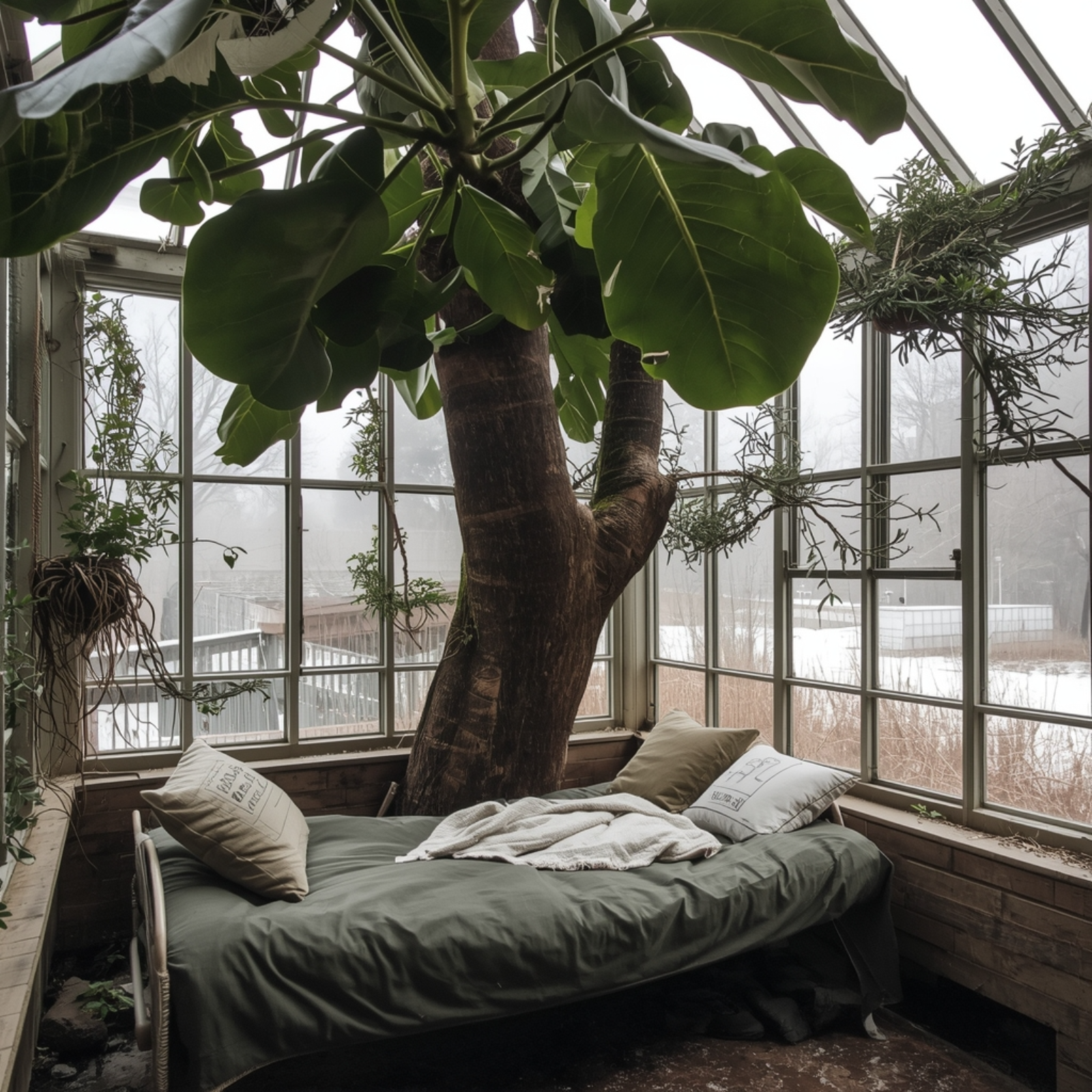 Imagine being in a conservatory, a greenhouse, of sorts, in the middle of a quiet snowstorm.