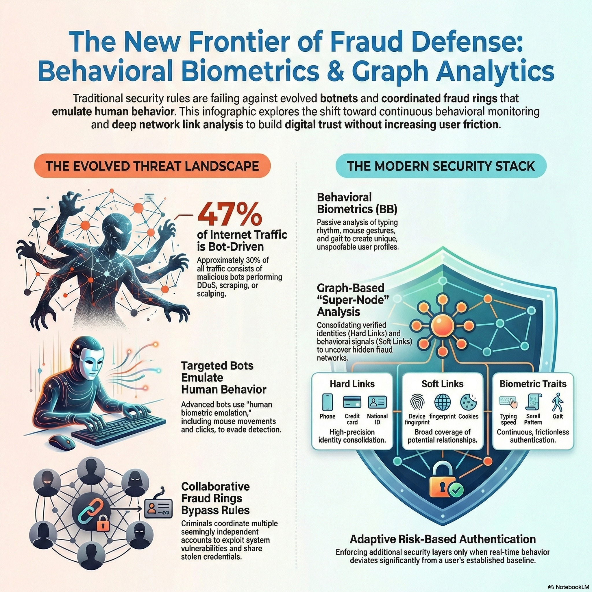 Modern cybersecurity faces sophisticated threats like botnets, insider attacks, and fraud. Organizations utilize Behavioral Biometrics and UEBA to establish baseline user profiles. By analyzing unique patterns like keystroke dynamics, these systems enable real-time defense.