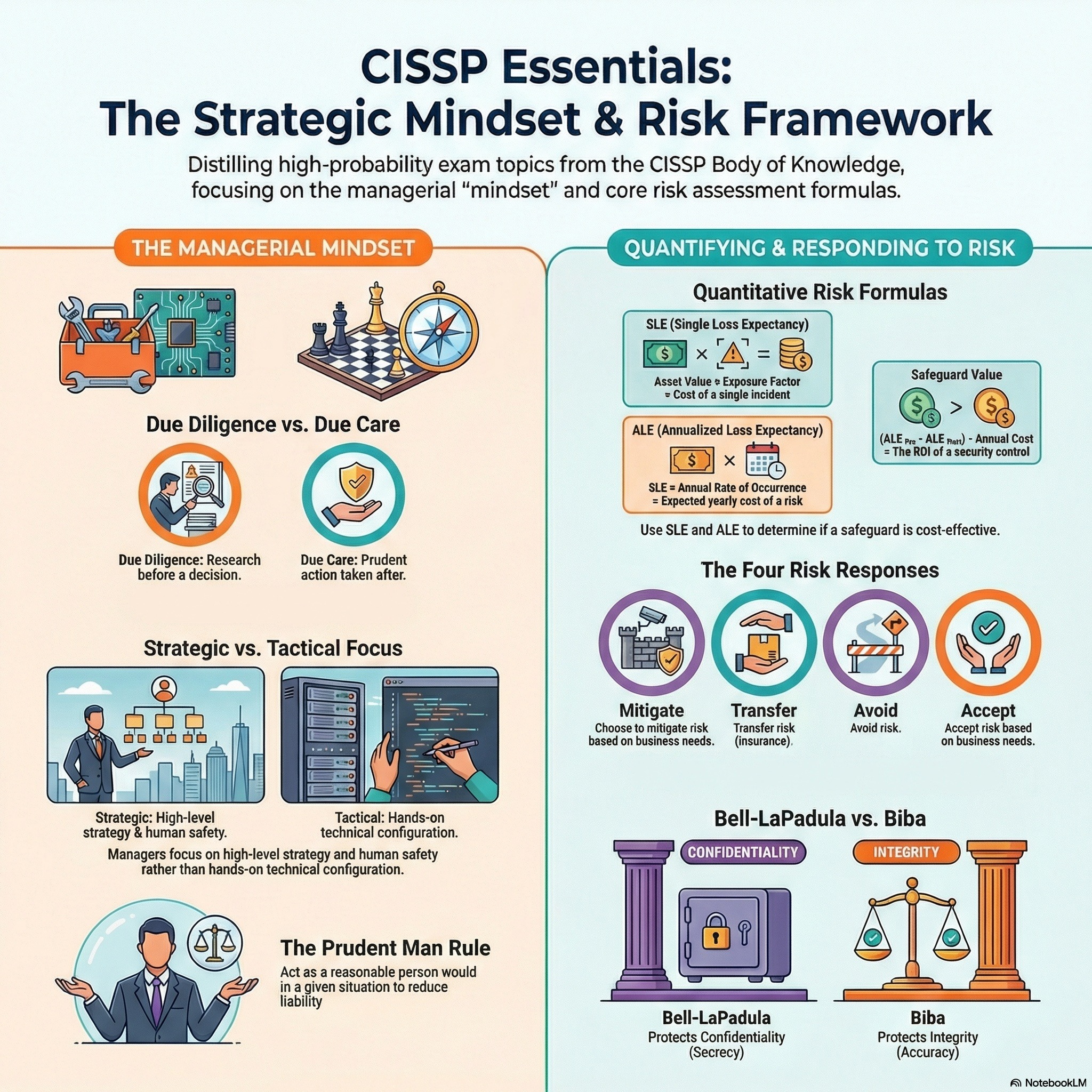 The CISSP exam focuses on risk management, requiring a managerial mindset to align security with business goals. Key concepts include Due Care (action) versus Due Diligence (research), the CIA triad, and the OSI model. Human life is always the top priority. This podcast focuses on how to think like a manager to master the CISSP.