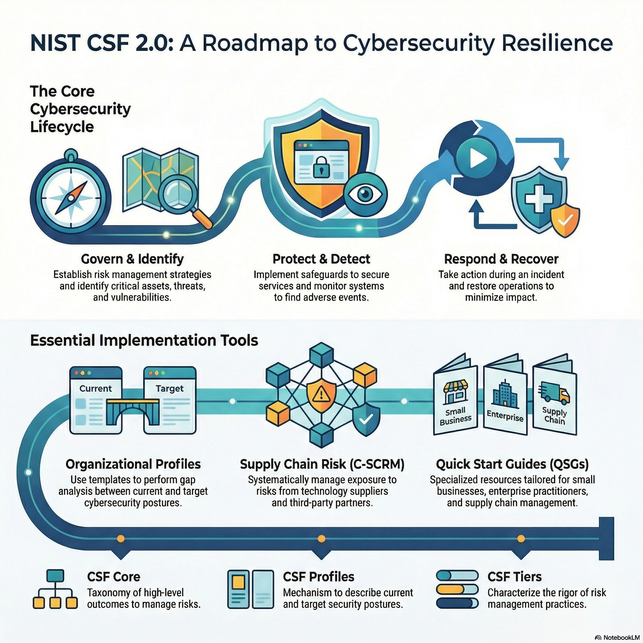 The NIST Cybersecurity Framework (CSF) 2.0 serves as a foundational guide for organizations of all sizes to manage and reduce cybersecurity risks through a standardized taxonomy of functions and outcomes. A central component of this manual is the use of Organizational Profiles, which allow entities to document their Current Profile of existing practices and define a Target Profile representing their desired security posture. By performing a Gap Analysis between these two states, organizations can identify deficiencies and build a prioritized Action Plan to improve their resilience. The framework is supported by a suite of online resources, including Implementation Examples for...