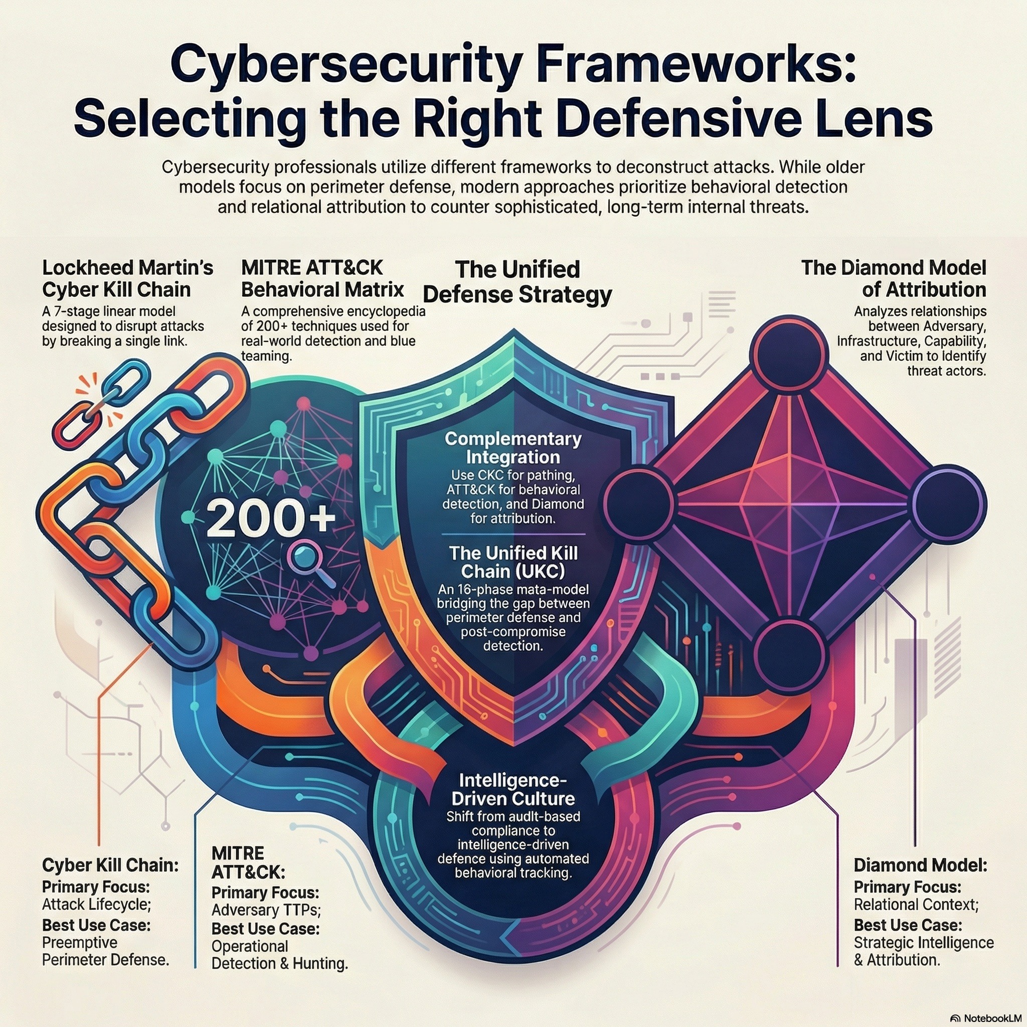 This podcast analyzes and compares three primary frameworks used in modern cybersecurity: the Lockheed Martin Cyber Kill Chain, the MITRE ATT&CK Matrix, and the Diamond Model of Intrusion Analysis. The Cyber Kill Chain offers a linear perspective on the stages of an attack, while MITRE ATT&CK provides an extensive database of specific adversary behaviors and technical methods. In contrast, the Diamond Model focuses on the underlying relationships between an attacker, their capabilities, the infrastructure used, and the ultimate victim. Experts suggest that integrating these models allows organizations to move beyond simple alerts toward a more strategic understanding...