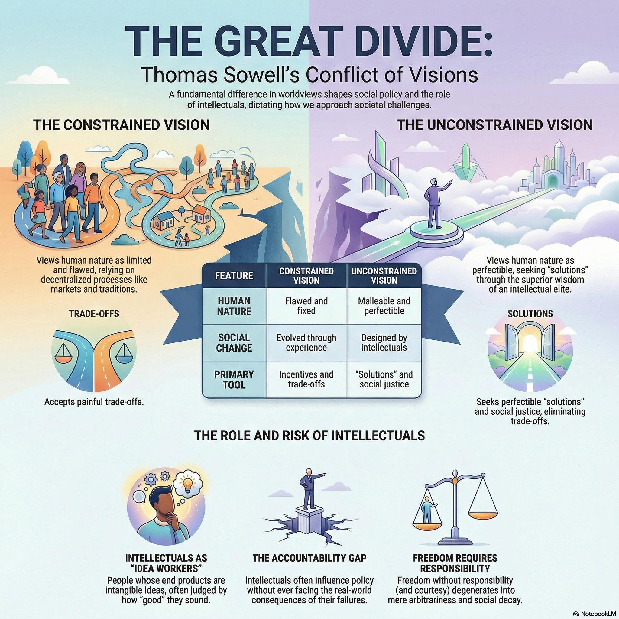 This podcast profiles the life and philosophy of Thomas Sowell, a prominent economist who critiques the "anointed" class of intellectuals for prioritizing abstract theories over empirical reality. The texts argue that modern intellectuals often champion a vision of "liberation" from traditional social restraints, which Sowell contends has historically led to disastrous outcomes like family disintegration and increased crime. Through books like Intellectuals and Society, he highlights a dangerous lack of accountability among idea workers who influence public policy without facing the consequences of their failed prescriptions. Parables within the collection further illustrate the risks of abandoning ancestral wisdom and...