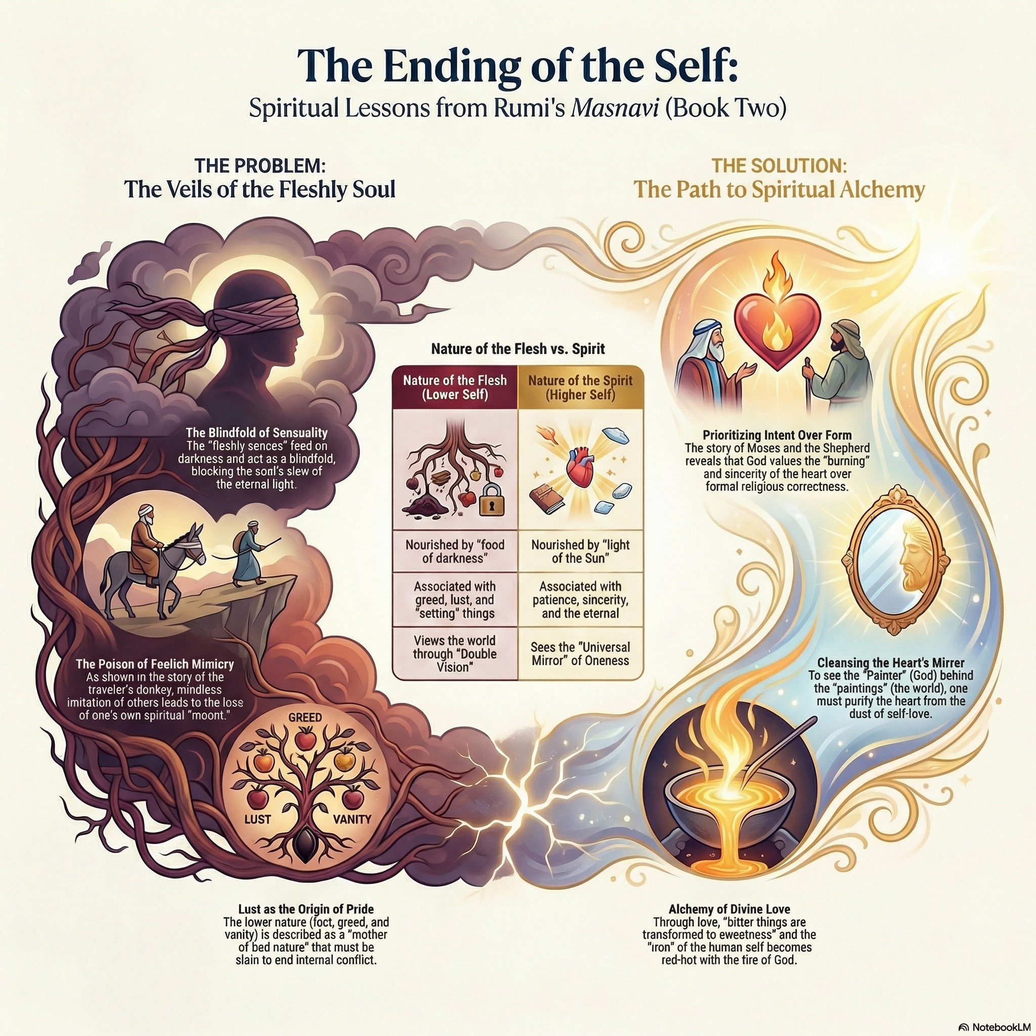 This podcast examines the mystical and pedagogical dimensions of Sufism, primarily through the symbolic Quranic narrative of Moses and the spiritual guide Khidr. Scholars and poets like Rumi and al-Qushayri use this story to illustrate the master-disciple relationship, emphasizing that true wisdom often transcends external law and human logic. The texts explore how mystical "unveiling" allows practitioners to move beyond physical senses to perceive divine realities and achieve spiritual purity. Further commentary connects these Islamic traditions to broader philosophical frameworks, including Neoplatonism and historical hagiographies of various saints. Ultimately, the collection highlights the transformation of the soul from worldly...