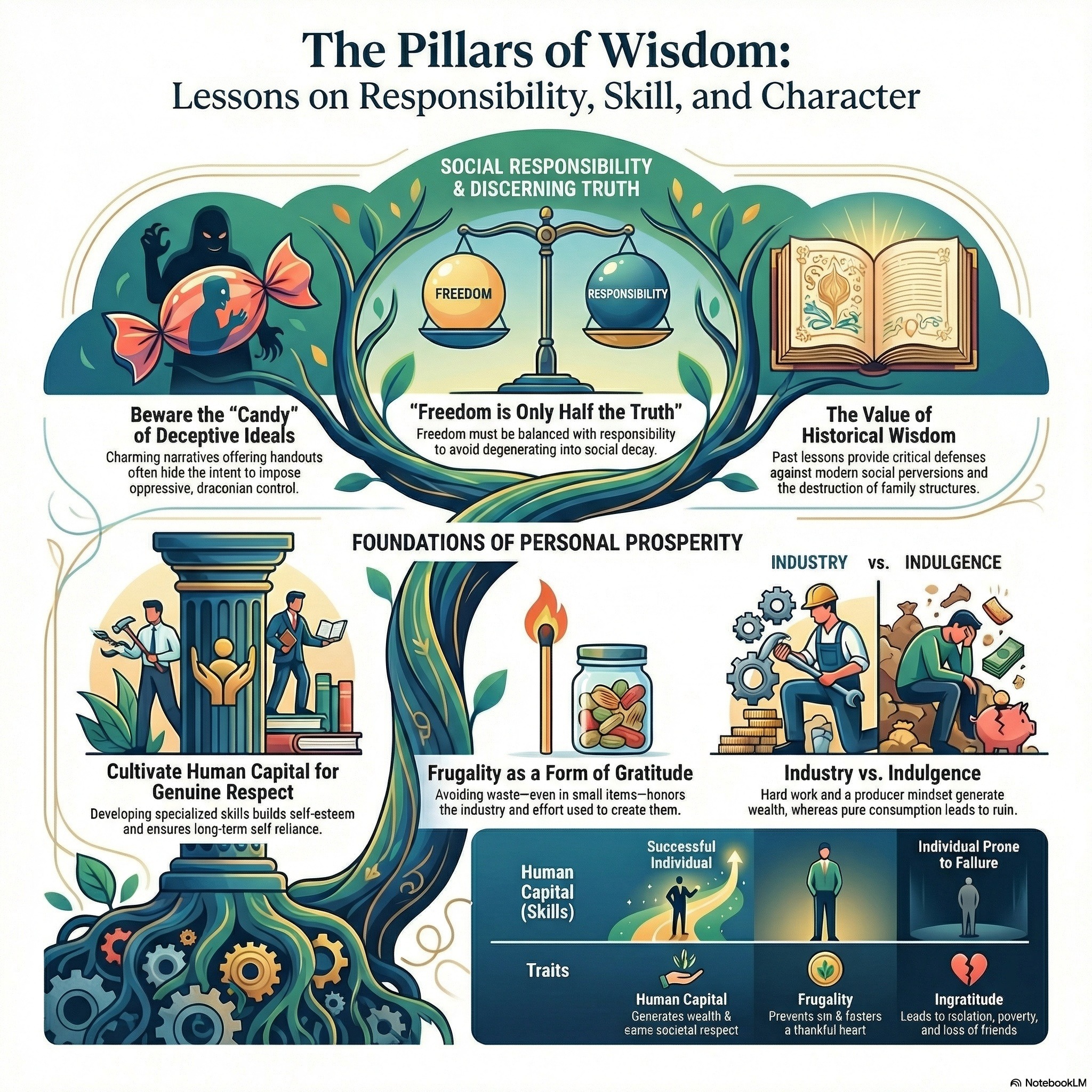 These moral fables emphasize the vital connection between personal responsibility, gratitude, and discerning wisdom. The first story illustrates how human capital and frugality are more valuable than inherited wealth, as a spoiled son only finds true purpose after losing everything and recognizing his father's foresight. In the second narrative, the consequences of gossip and the danger of freedom without accountability are explored through the manipulation of two oak trees by malicious crows. The third account warns against deceptive ideologies and the loss of liberty, using charming snakes to symbolize how societies can be hypnotized into surrendering their values. Finally...