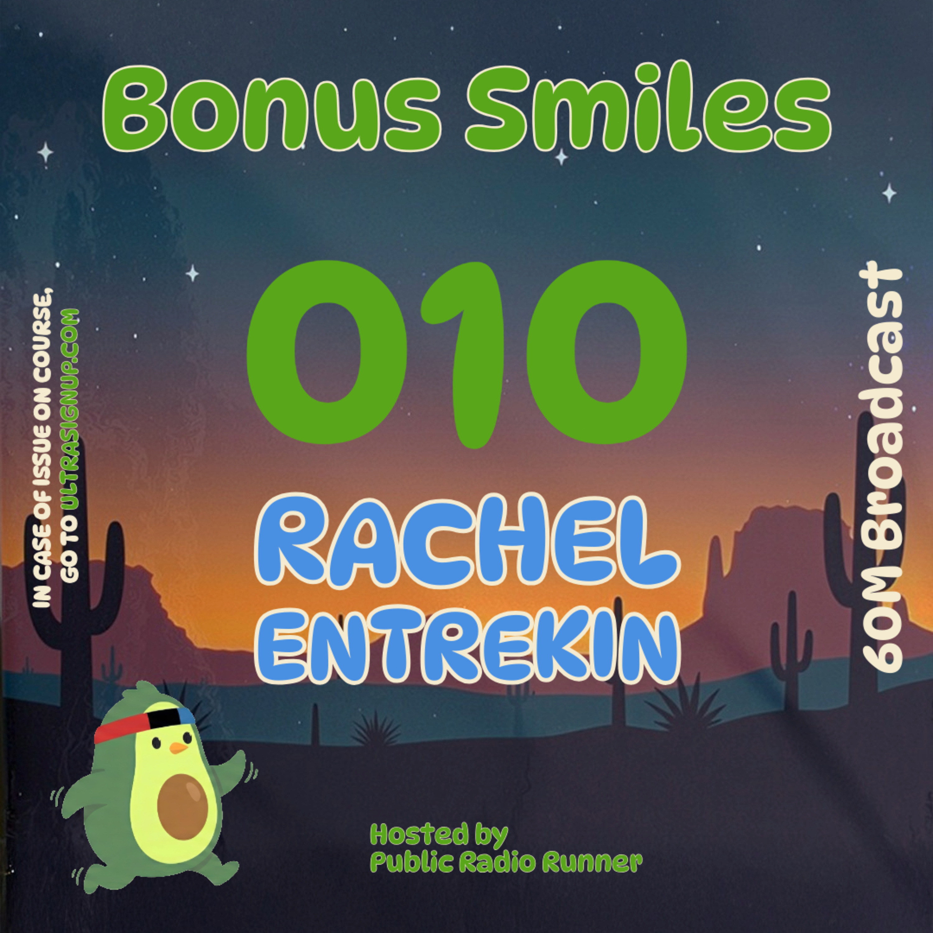 Welcome to Bonus Smiles! A music and interview show that’s fueled by runners and their playlists! I’m Public Radio Runner. Ultra running comes in many flavors–and in this episode Rachel Entrekin takes us inside some of her adventures from backyard 50 milers to Cocodona 250. From questionable nutrition hacks to an aid station performance. We talk about the highs, the lows, and the music that gets her through both.