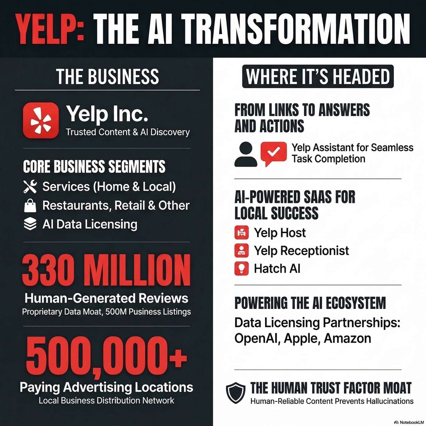 Yelp's structural advantage is its massive corpus of trusted, human-generated reviews, offering local authority that general AI models cannot easily replicate.
