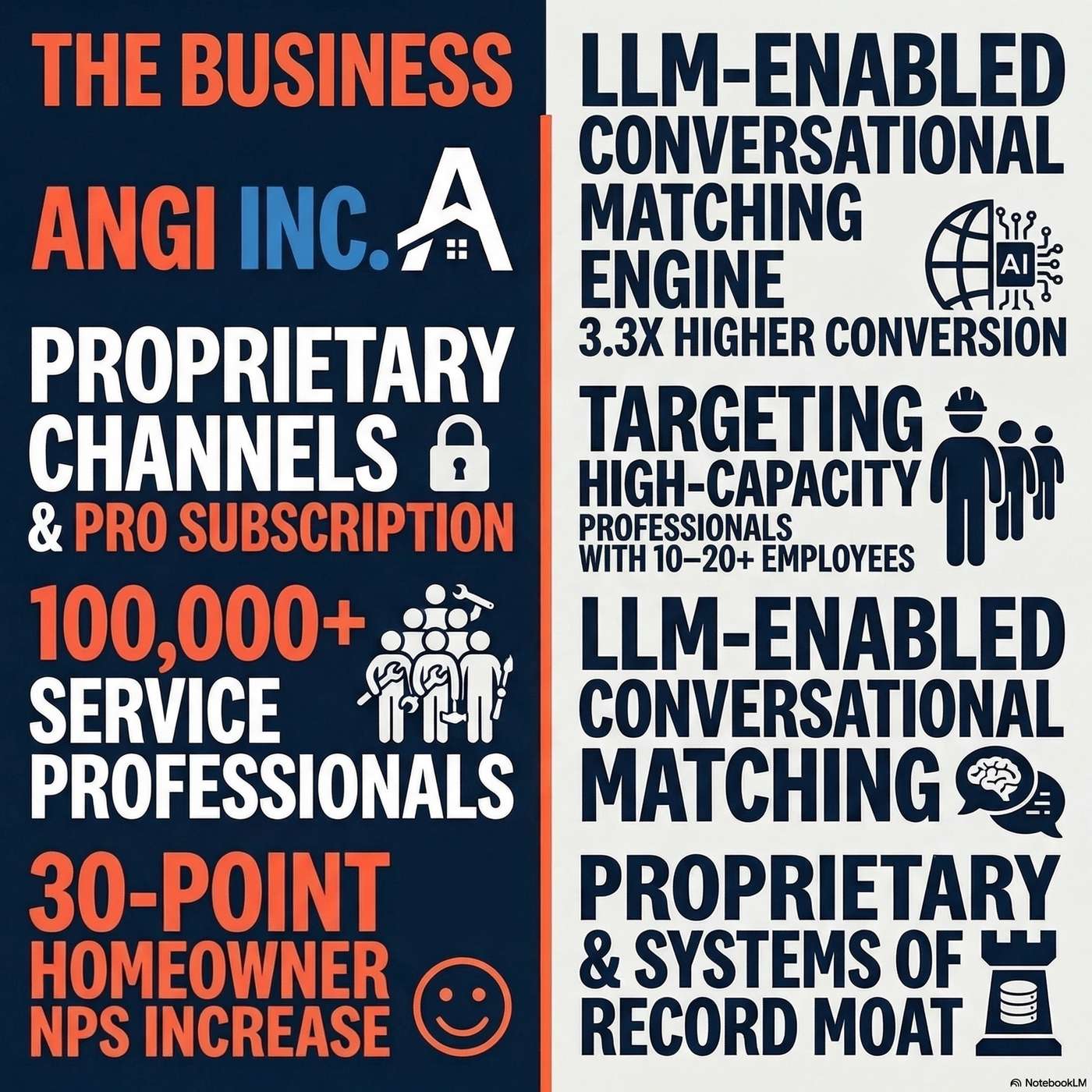 Angi's competitive moat stems from its massive network of over 100,000 active pros and decades of proprietary data on homeowner matching and behavior.