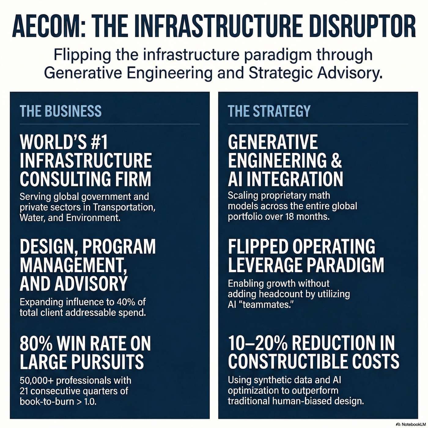 Business Synopsis & Direction. AECOM is a global infrastructure consulting firm designing and managing complex projects across transportation, water, and facilities.