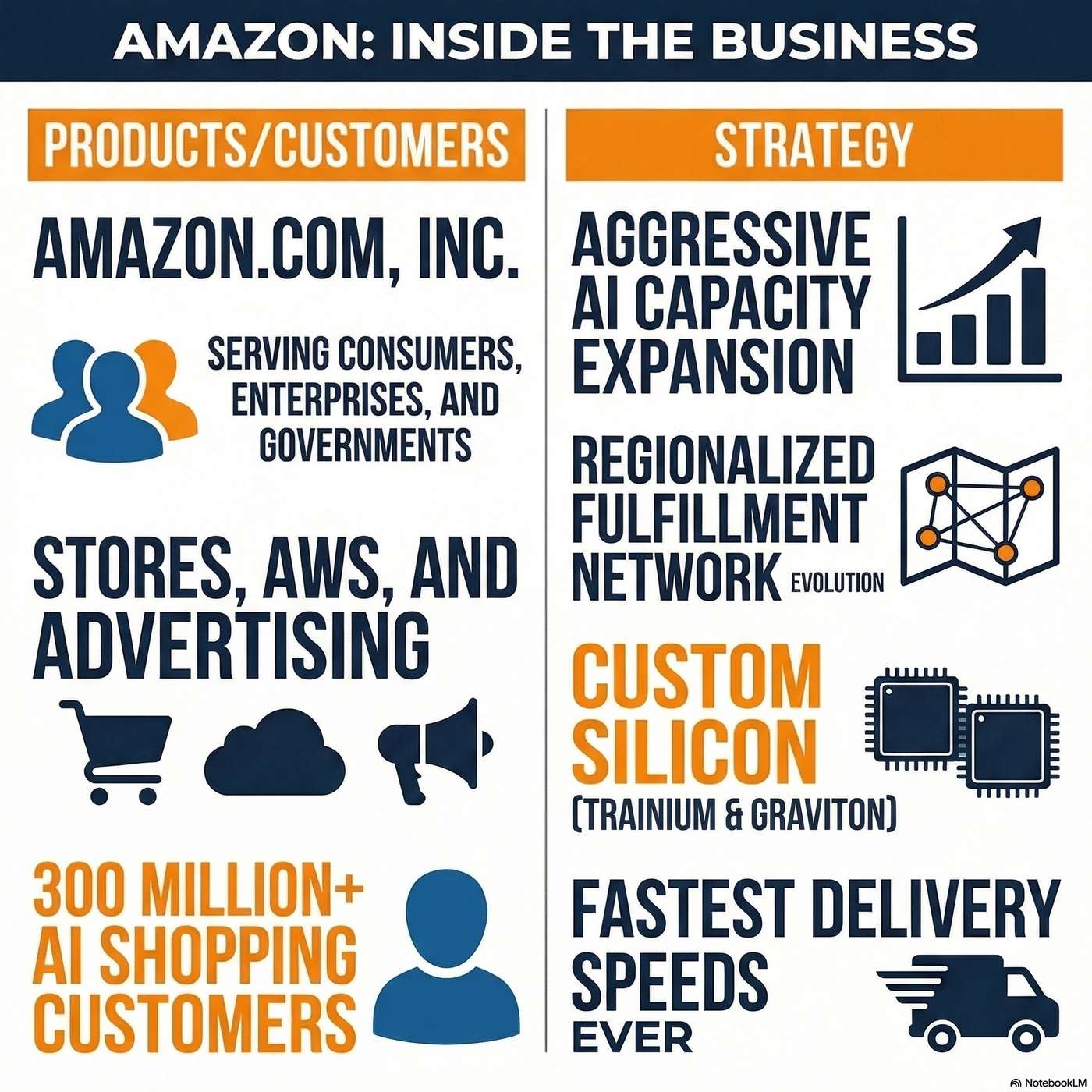 Differentiation & Products Amazon’s competitive moat in retail is driven by its regionalized fulfillment network, which dramatically lowers cost-to-serve while enabling record delivery speeds. In the cloud sector, AWS differentiates with a to...