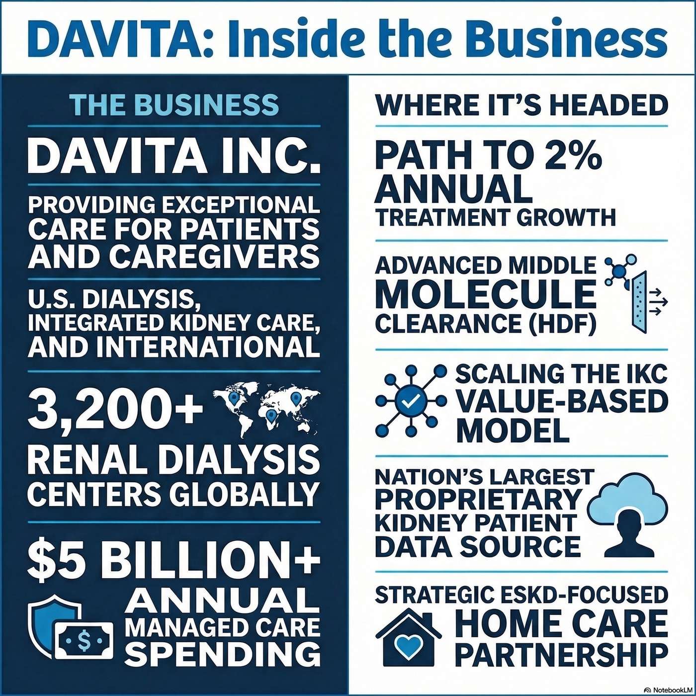 Business Synopsis & Direction. DaVita operates a vast network of U.S. and international dialysis centers, generating revenue by providing essential, life-sustaining treatments to end-stage kidney disease patients.