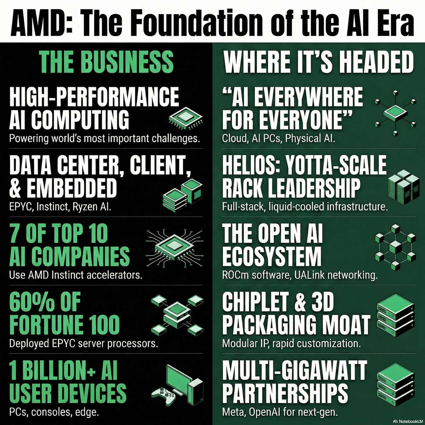 The company differentiates itself through an advanced chiplet architecture, enabling flexible, workload-optimized compute, and an open-source software ecosystem anchored by ROCm. AMD’s leading EPYC server CPUs and Instinct GPUs are being integrated into turnkey, rack-scale solutions like the Helios platform.