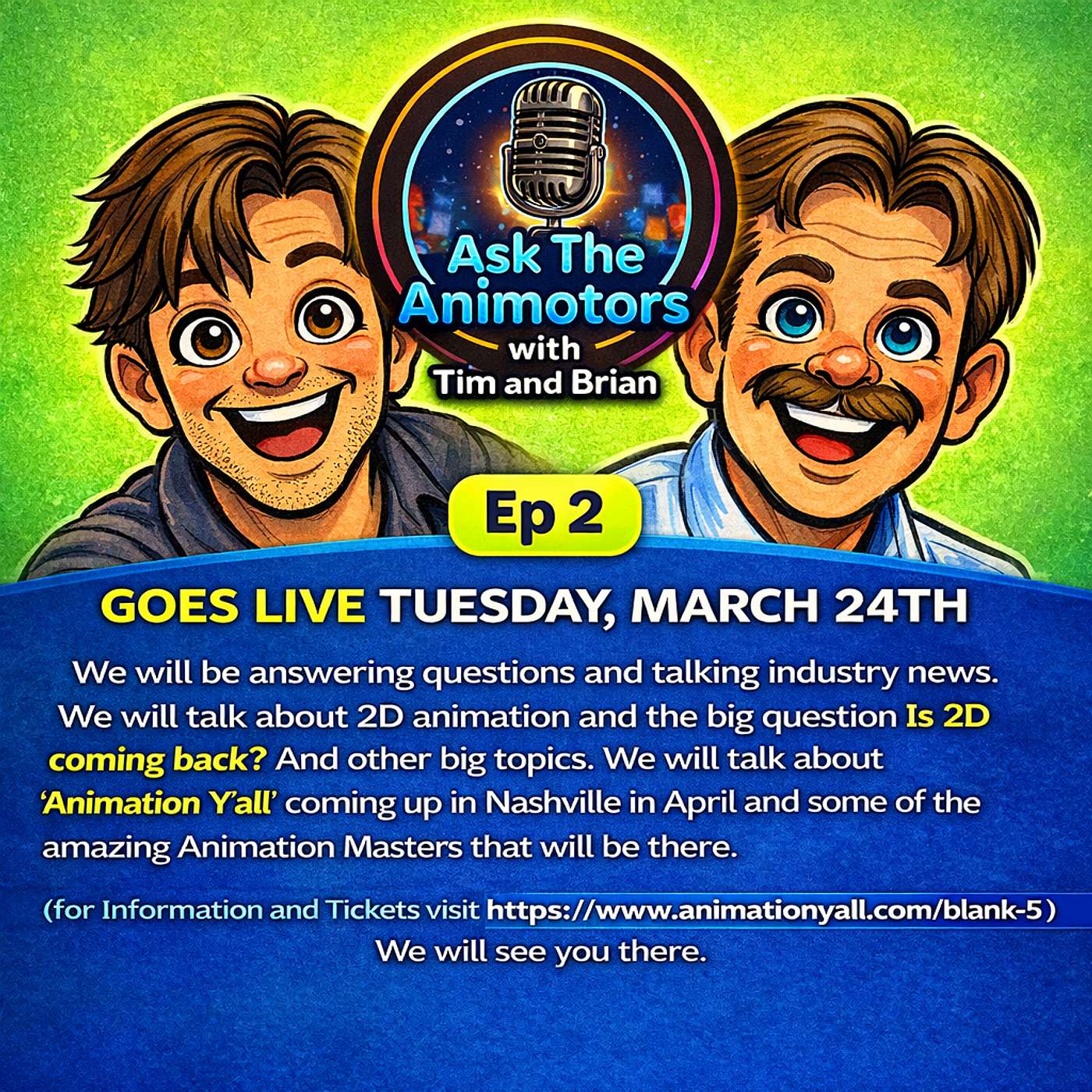 "Ask The Animators" with Tim and Brian, Ep 2 - we will be answering questions and talking industry news. We will talk about 2D animation and the big question "Is 2D coming back'? And other big topics. We will talk a bit about "Animation Y'all" coming up in Nashville in April and some of the amazing Animation Masters that will be there.