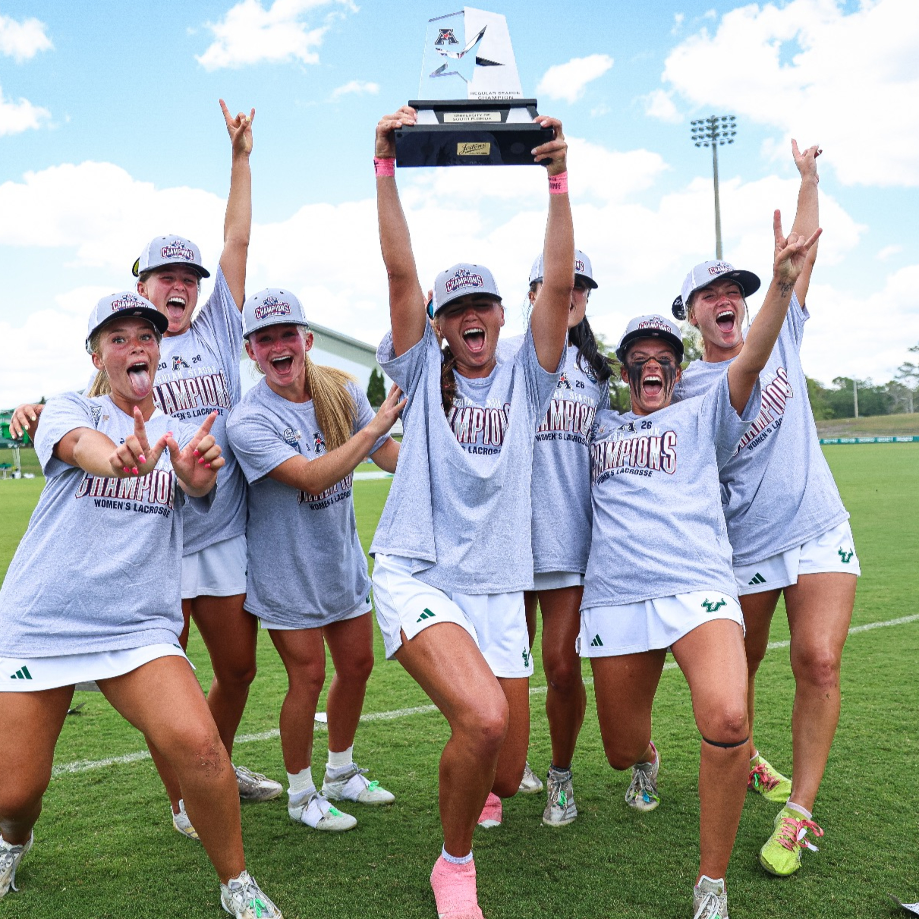 Mindy McCord, Elise Grissett, Kaitlyn Tartaglione on field after Lacrosse Wins American Conference Regular Season Title